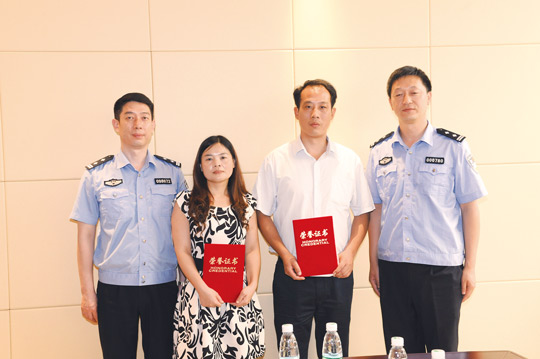6月12日,湖北省潛江市授予王林華(右二)和秦開美(右三)“潛江市見義勇為先進個人”榮譽稱號,并授予王林華“優秀共產黨員”稱號,授予秦開美“師德標兵”稱號。記者 瞿芃 攝