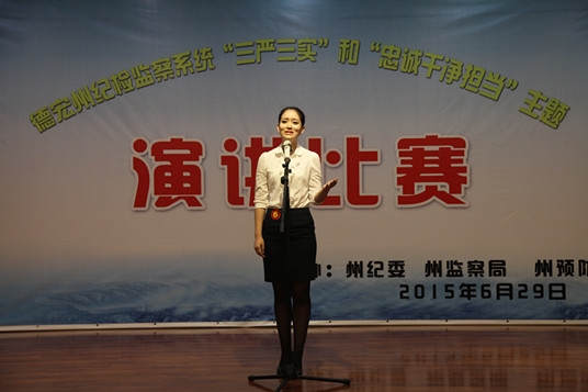 比賽中,從州和各縣市紀委預賽中脫穎而出的12名選手,寓情、寓理、寓事、寓服務理念,對廣大紀檢監察干部自覺踐行“三嚴三實” 和“忠誠干凈擔當”進行生動演說。來自州紀委黨風室的沙正本以《也說生態環境》為題,發出“我要盡我所能為修復政治生態、掃除天空陰霾、排除發展障礙、鑄就美好未來貢獻所有力量”的錚錚誓言。“如何才能成為一名合格的紀檢監察干部?”來自盈江縣紀委的韋子江用盈江抗震救災和恢復重建中涌現出的一個個紀檢監察干部的生動故事,作出值得深思的答案。來自芒市軒崗鄉的紀檢專干董蕾蕾深情講述了一位80后年輕女干部的工作點滴,令觀眾們動容,“當你選擇為人民服務的工作,這便是一種責任、一種態度、更是一種務實的精神。”