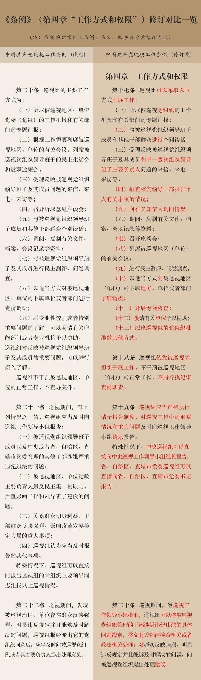 《中國共產(chǎn)黨巡視工作條例》從有利于發(fā)現(xiàn)問題、形成震懾出發(fā),將黨的十八大以來一些行之有效的創(chuàng)新做法充實(shí)進(jìn)來,增加了“抽查核實(shí)領(lǐng)導(dǎo)干部報(bào)告?zhèn)€人有關(guān)事項(xiàng)的情況”、“向有關(guān)知情人詢問情況”、“開展專項(xiàng)檢查”等方式,對(duì)原條例規(guī)定的受理信訪、到有關(guān)地方(單位)或者部門了解情況、提請(qǐng)有關(guān)單位協(xié)助等方式進(jìn)行了修改,并增加了“派出巡視組的黨組織批準(zhǔn)的其他方式”這一授權(quán)性條款,這些規(guī)定進(jìn)一步拓寬了巡視發(fā)現(xiàn)問題的途徑。