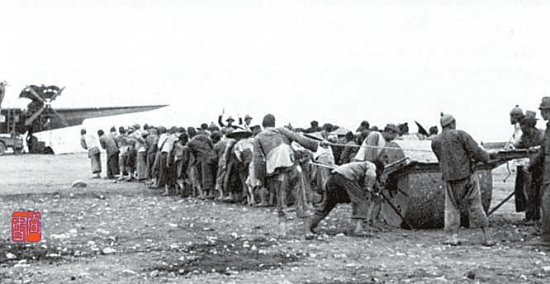 修建機場跑道的多道工序,都需要召集50-150民工拉動石碾子來回碾壓