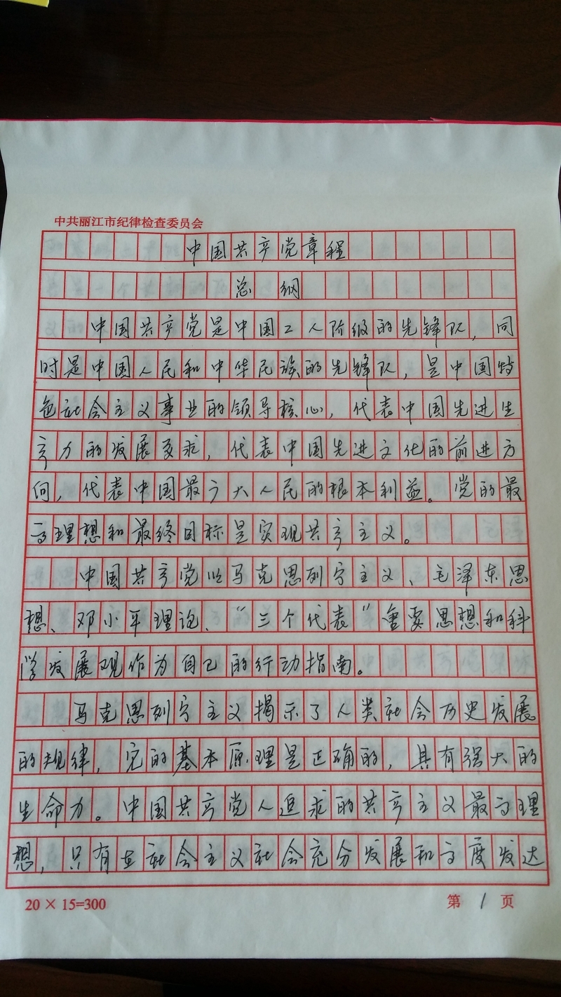 自麗江市全體黨員“兩學一做”學習教育啟動以來,全體紀檢監察干部按照中央、省委、市委部署要求,認真開展學習教育,在學習教育中走在前面、深學一層,作出示范,積極營造學黨章、遵黨規、守黨紀的濃厚氛圍,嚴格遵守國家法律法規,爭做“忠誠干凈擔當”表率。并開展每名黨員干部手抄一遍黨章活動,以《中國共產黨章程》《中國共產黨廉潔自律準則》《中國共產黨紀律處分條例》為重點內容,采取自學手抄、黨章黨規網絡知識測試、知識競賽等相結合的方式進行學習。其中,自學手抄環節以手抄黨章為主,通過手眼并用,讓黨章意識入腦入心,切實把黨章這個總規矩立起來,刻印在每一名黨員的心頭上,落實到每一天的行動中。