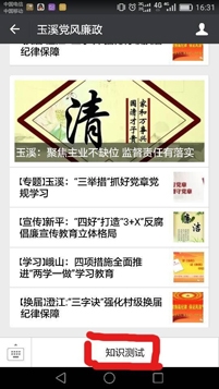為確保“學黨章黨規、學系列講話,做合格黨員”和黨章黨規“進黨校、進課堂、進媒體”學習教育的效果,玉溪市紀委利用手機微信平臺開通黨章黨規掌上學習測試活動的鏈接欄目,只要關注“玉溪黨風廉政微信”微信公眾號,進入公眾號后,點擊“知識測試”,頁面就可以跳轉至云南省紀委監察廳網站“黨章黨規知識網絡測試系統”進行測試。