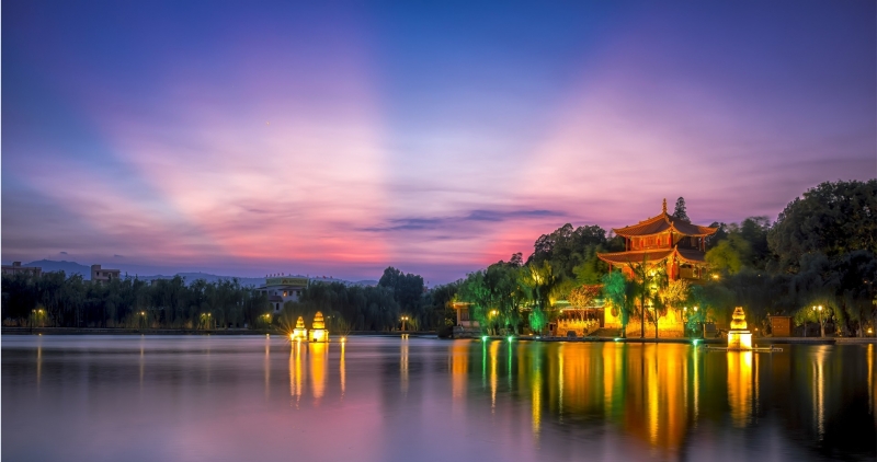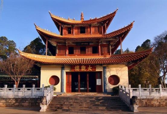 昆明大觀樓,位于昆明市西山區近華浦南面,三重檐琉璃戧角木結構建筑。大觀樓最初建成于1828年,是觀賞滇池的好地方,登樓四顧,景致十分遼闊壯觀,便取名為“大觀樓”。清康熙三十五年(1969年)始建二層樓宇。乾隆年間,孫髯撰寫長聯,由名士陸樹堂書寫刊刻,大觀樓因長聯而成為中國名樓。