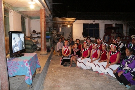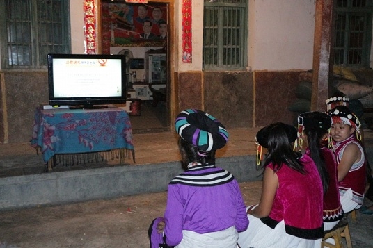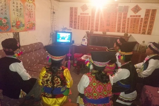 隆陽區(qū)芒寬鄉(xiāng)彝族群眾干完活回家一起觀看