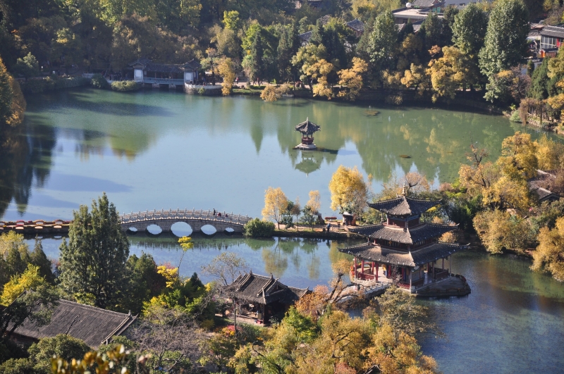 黑龍潭是麗江古城水源地,五孔橋與得月樓,是黑龍潭風景的精華所在。五孔橋下即為黑龍潭的出水口。黑龍潭出水口為九眼洞,意為九龍治水,九眼洞上建五孔橋,將黑龍潭一分為二。五孔橋橋欄上刻有石象、石獅;“象”和“獅”與“相思”諧音,故此橋又稱為相思橋。