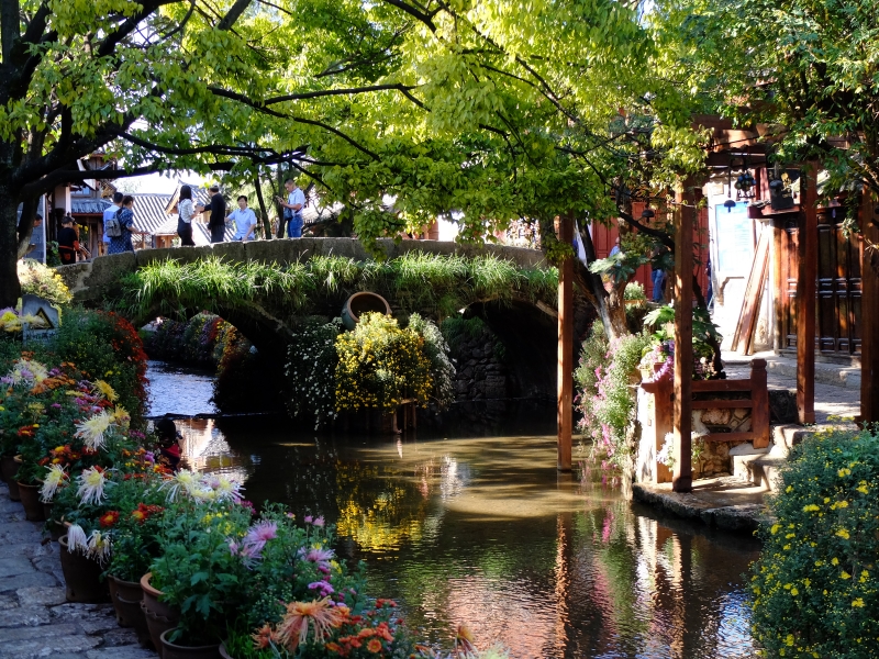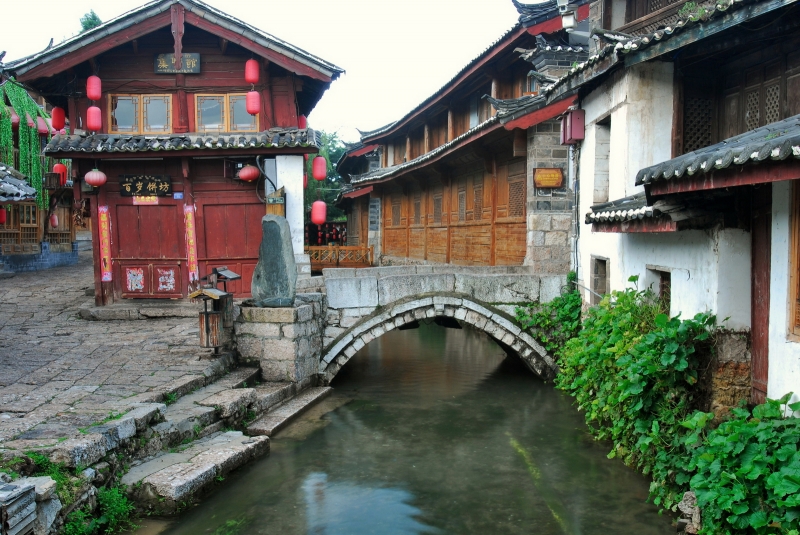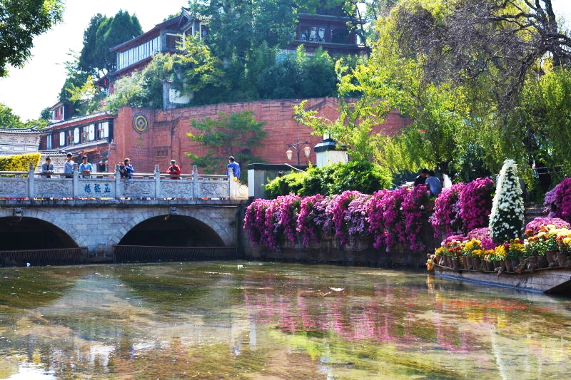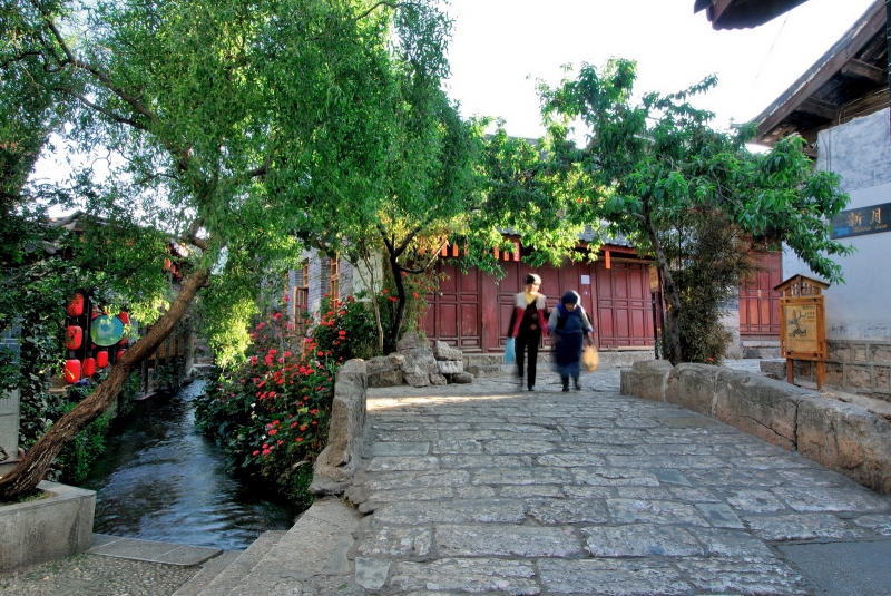 古城的橋小到一塊長木板擱兩端就連接起兩戶人家的過戶橋,大到長10余米橫跨河面的大石橋,無一不寧靜祥和古意盎然,以其寬大包容了世界,它們默默無聞波瀾不驚,承載著時光與歷史,水與橋完美組合,構成了麗江古城獨特的風景。