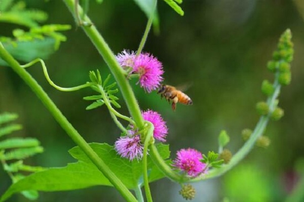 暖暖的陽光下,蜜蜂依然不辭辛勞,穿梭在含羞草的花朵間采擷花蜜