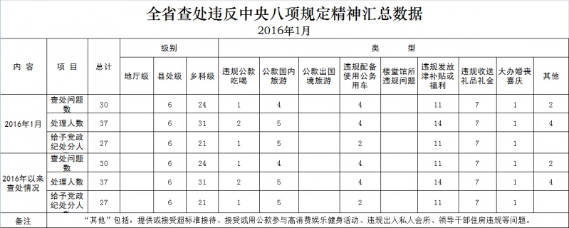 2016年1月,全省各級紀檢監察機關查處違反中央八項規定精神問題30起,處理37人,給予黨政紀處分27人。
