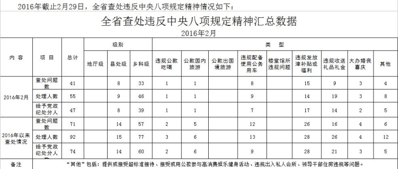 2016年2月,全省各級紀檢監察機關查處違反中央八項規定精神問題41起,處理55人,給予黨政紀處分47人。