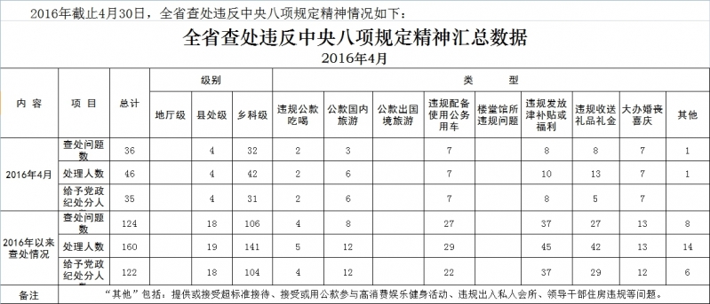 2016年4月,全省各級紀(jì)檢監(jiān)察機(jī)關(guān)查處違反中央八項規(guī)定精神問題36起,處理46人,給予黨政紀(jì)處分35人。