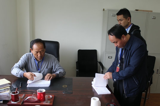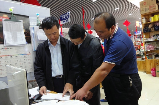 麗江市檢查組在超市辦公室查看最近單位購買貨物開具的發票存根,查看金額總數,物品單價和數量
