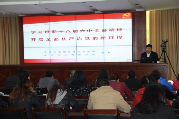 黨的十八屆六中全會召開后,文山州以州委理論學習中心組集中學習為切入點,采取組建宣講團(隊)宣講、單位領導輔導、干部職工進村點對點、入戶面對面等宣講方式,迅速在全州營造出領導干部帶頭講、干部群眾深入學的良好氛圍,進一步把學習貫徹全會精神引向深入。