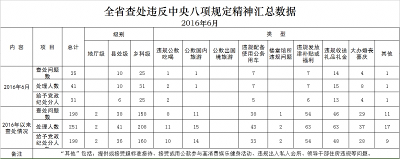 2016年6月,全省各級紀檢監察機關查處違反中央八項規定精神問題35起,處理41人,給予黨政紀處分31人。從查處問題類別看,違規收送禮品禮金問題14起,占40%;違規配備使用公務用車問題7起,占20%;違規發放津補貼或福利問題7起,占20%;大辦婚喪喜慶問題4起,占11.42%;違規公款吃喝1起,占2.86%;公款國內旅游1起,占2.86%;其他問題1起,占2.86%。