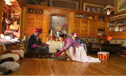 摩梭民居為具有典型民族風味的“井干式”木結構建筑,當地俗你“木羅子”或“木楞房”。摩梭人的母系大家庭往往人口眾多,典型的摩梭民居是由4幢“木楞房”圍合而成的四合院。摩梭人的四合院直觀反映其婚姻形態、家庭組織和宗教信仰,是母系農耕社會的一種形式載體。