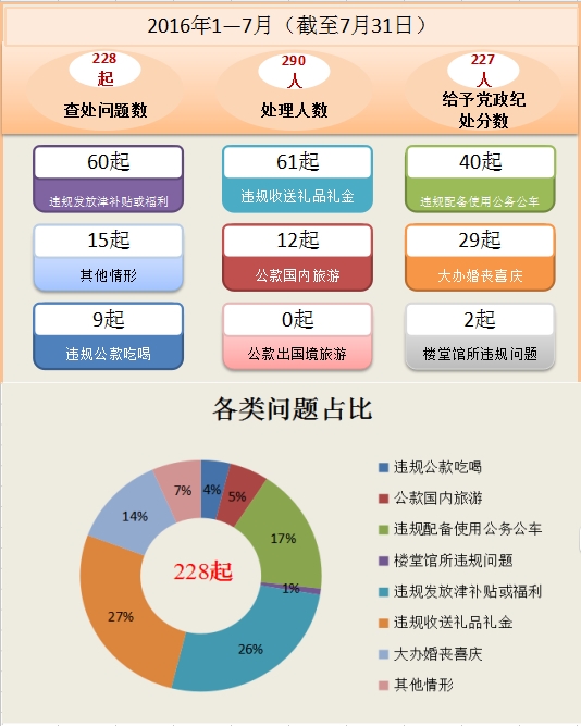 今年1至7月,云南省各級紀(jì)檢監(jiān)察機(jī)關(guān)查處違反中央八項規(guī)定精神問題228起,處理290人,給予黨政紀(jì)處分227人。從查處問題類別看,違規(guī)發(fā)放津補(bǔ)貼或福利問題60起,占26.3%;違規(guī)收送禮品禮金問題61起,占26.7%;違規(guī)配備使用公務(wù)用車問題40起,占17.5%;大辦婚喪喜慶問題29起,占12.7%;違規(guī)公款吃喝問題9起,占4%;公款國內(nèi)旅游問題12起,占5.2%;樓堂館所違規(guī)問題2起,占1%;其他問題15起,占6.6%。