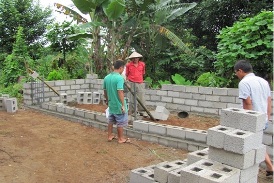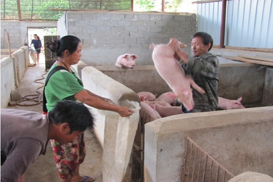 村民領取建蓋豬圈的材料