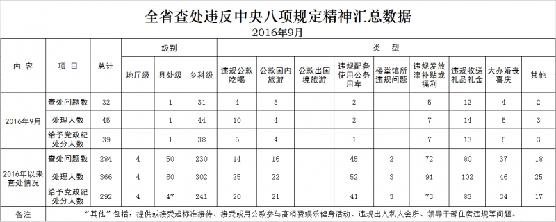 2016年9月,全省各級紀檢監(jiān)察機關(guān)查處違反中央八項規(guī)定精神問題32起,處理45人,給予黨政紀處分39人。從查處問題類別看,違規(guī)收送禮品禮金問題12起,占37.5%;違規(guī)發(fā)放津補貼或福利問題5起,占15.63%;大辦婚喪喜慶問題4起,占12.5%;違規(guī)公款吃喝4起,占12.5%;公款國內(nèi)旅游3起,占9.37%;違規(guī)配備使用公務(wù)用車問題2起,占6.25%;其他問題2起,占6.25%。