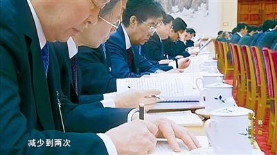 圖二:2012年12月15日召開的中央經濟工作會議,是八項規定出臺后召開的第一個全國性重要會議。首先引人矚目的是主席臺上的變化:沒有擺放綠色植物和鮮花,主席臺上就座的中央領導同志大大減少,政治局委員和會議代表坐在了一起,簡單樸素的會場直觀地展示了新的會風。會議議程也將往年的三次全體會議減少到兩次,兩天半的會期壓縮到兩天。