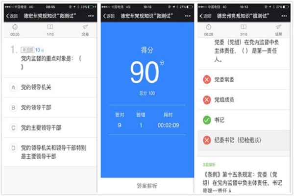 德宏州黨規(guī)知識“微測試”,以《中國共產(chǎn)黨廉潔自律準則》《中國共產(chǎn)黨紀律處分條例》《中國共產(chǎn)黨問責條例》《關于新形勢下黨內(nèi)政治生活的若干準則》《中國共產(chǎn)黨黨內(nèi)監(jiān)督條例》等黨內(nèi)法規(guī)和德宏州相關紀律規(guī)定為內(nèi)容,每月進行一次,每次選一部黨內(nèi)法規(guī)進行“微測試”。而此次以《中國共產(chǎn)黨黨內(nèi)監(jiān)督條例》為主要內(nèi)容,全州各級各部門在職黨員干部參加“微測試”。