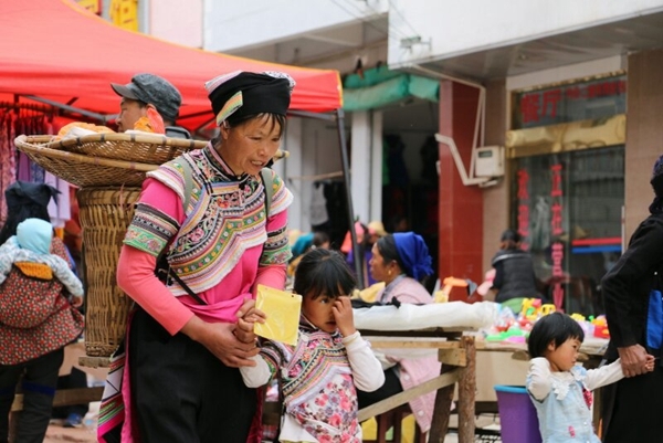 著各式民族服裝的婦女們或背著大筐,或背著孩子,從附近趕來,紛紛挑選春節需要的各種日用商品(昆明市官渡區紀委 鄭東淑)
