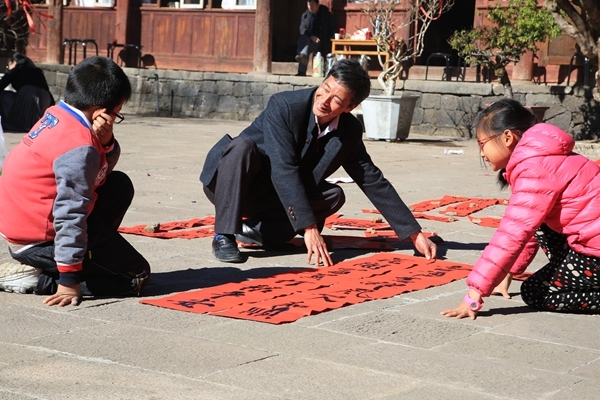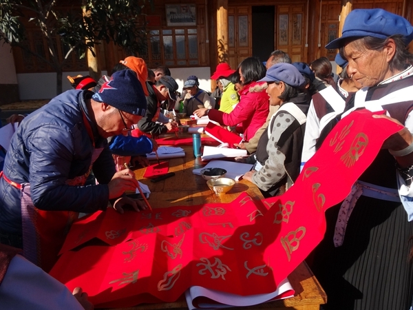 納西族書畫愛好者用東巴文字撰寫春聯(麗江市紀委 舒英妹)