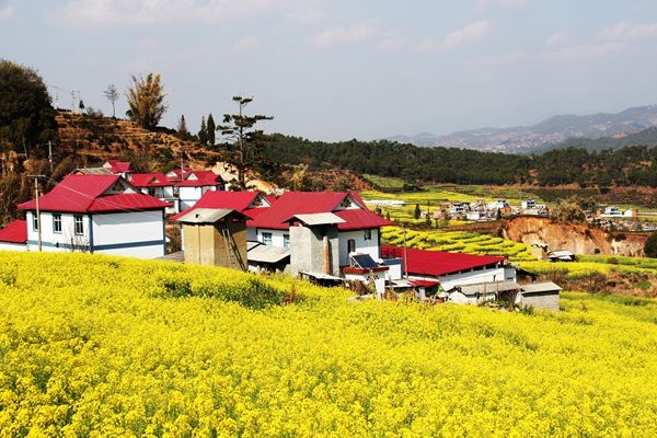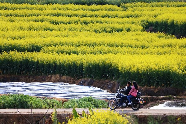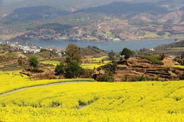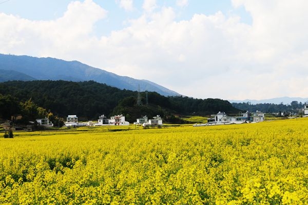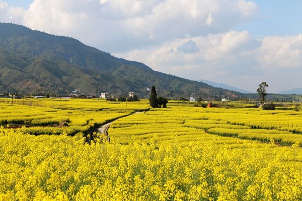 順著瘦瘦的臨滄南汀河逆流而上,在接近藍(lán)天的高度,純金的油菜花黃得放肆。臨翔區(qū)博尚鎮(zhèn)金色的大地顯得有的點(diǎn)不真實(shí),仿佛誰添上的重彩,濃稠而飽滿。春天的博尚,5萬多畝的油菜種植面積,夠蜜蜂忙活了,也足以夠游人陶醉。