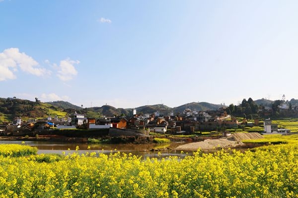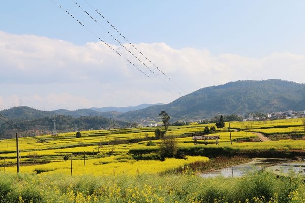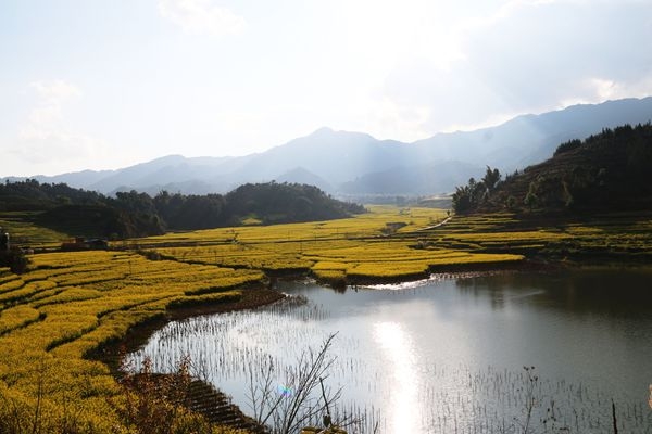 博尚已有幾百年的油菜種植史,從低凹處往高處走,油菜花一直開到系著淡云的山腰,然后又從一座山的高處狂泄,將小小的村莊淹沒,金色的花瓣成為世界上最小的舟輯,在南汀河細(xì)浪里飄搖跌宕。正應(yīng)了那句 “籬落疏疏小徑深,樹頭花落未成陰。兒童急走追黃蝶,飛入菜花無處尋。”的真實(shí)寫照。