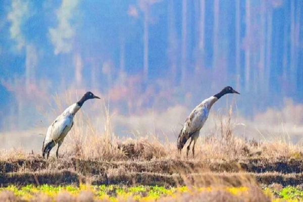 黑頸鶴(學名:Grus nigricollis)別稱高原鶴、藏鶴、雁鵝等,屬大型涉禽。黑頸鶴名列中國98種特有鳥類中的第26號,屬于中國國家一級保護動物。近日,仙鶴路經盈江縣昔馬鎮,讓我們漫步在美麗的昔馬,觀賞仙鶴仙姿。據了解,這也是德宏第一次記錄到黑頸鶴。