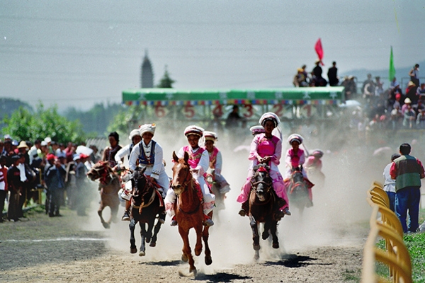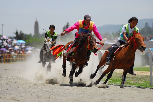 大理三月街賽馬歷史悠久,《徐霞客游記》中對三月街賽馬盛況曾進行過描述:“余乃仍由西門西向一里半,入演武場,俱結棚為市,環錯紛紜。其北為馬場,千騎交集,數人騎而馳于中,要隊以覘交下焉。”賽馬大會上,來自全國各地的優秀騎手進行跑馬射箭、飛馬拾紅等比賽,給觀眾帶來一場難得的視覺盛宴。