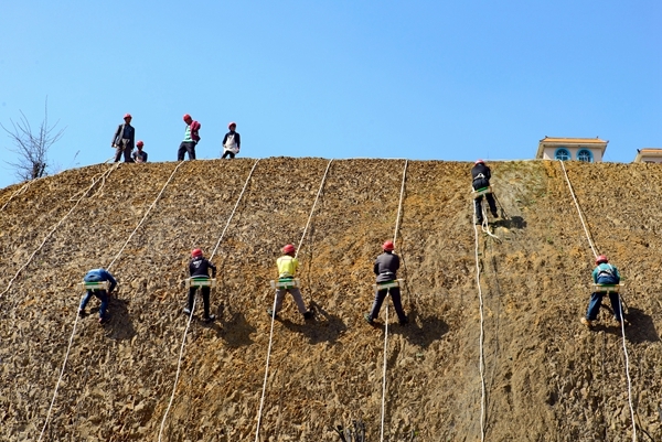 新修建的公路兩旁,筑路工人頭頂烈日,腰間纏繞著一根繩索,爬行在陡峭的斜坡上,徒手將危石一一排除,只為路上行人平安出行。