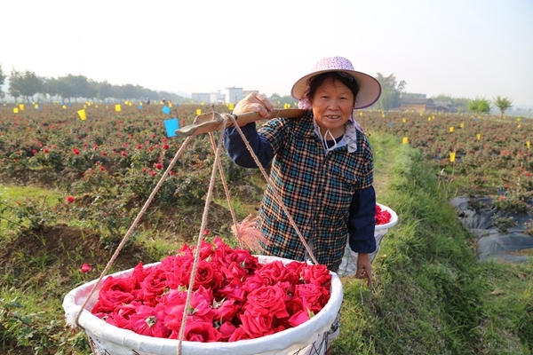 顧不得摘玫瑰時候被扎破的手,一路小跑的急著把玫瑰花送到工廠去加工。