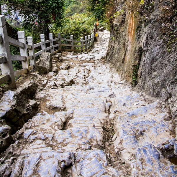 “五尺道”修建時因山勢太險,鑿通不易,只能在巖石上架柴猛燒,后潑冷水使之炸裂,最后通過人為打鑿成為可通行的道路。