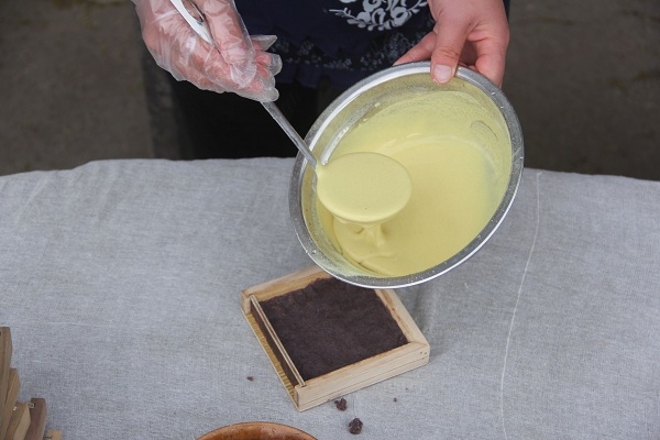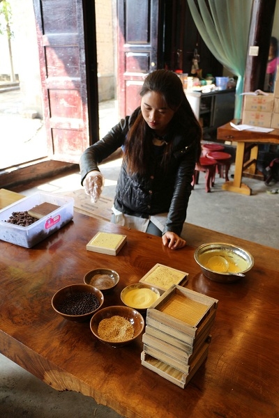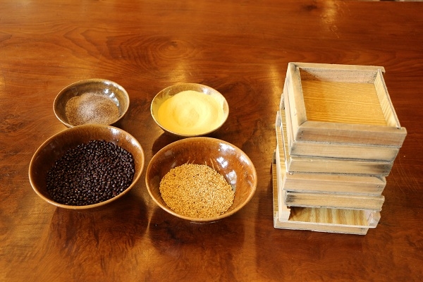 制作松花糕顏料:紅豆、芝麻、松花粉、紅糖、模具