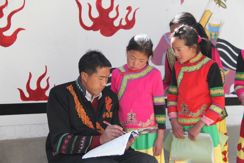 1998年大理民族師范畢業(yè)后,沙新華,這位大山哺育的彝族小伙子主動回到了石照壁村,當(dāng)起了幾十個學(xué)生的“孩子王”。19年來,沙老師送走了一批又一批學(xué)生,看著一批又一批的孩子從七、八歲的懵懂頑童長成意氣風(fēng)發(fā)的少年。