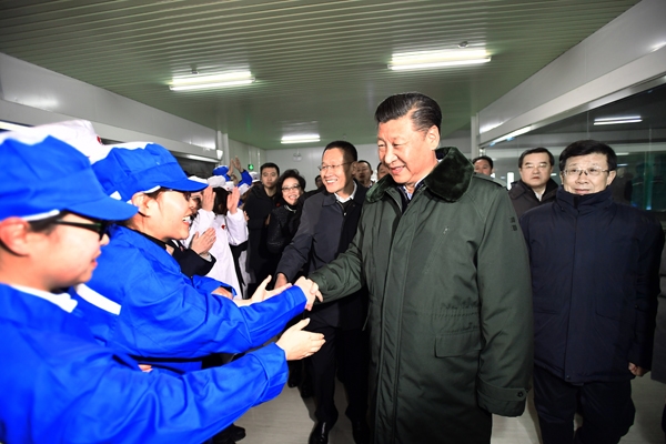 1月24日,中共中央總書(shū)記、國(guó)家主席、中央軍委主席習(xí)近平來(lái)到河北省張家口市,看望慰問(wèn)基層干部群眾,考察脫貧攻堅(jiān)工作。這是習(xí)近平在張家口市察北管理區(qū)的旗幟嬰兒乳品有限公司向職工拜年。(新華社記者 李濤 攝)