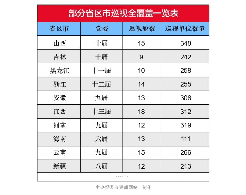 目前,仍有部分省區市在按照計劃有條不紊地開展巡視工作,即將在換屆之前完成巡視全覆蓋的任務。