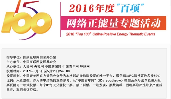 本次活動投票時間為2017年5月5日至5月11日24:00,投票規則:中國青年網官方微信公眾號為本次活動微信端投票的唯一平臺,微信端與PC端投票數各按50%比例計入總票數,作為終審結果的重要參考。從“中國青年網”(ID:youthzqw)微信公眾號菜單欄進入投票頁面可一站式投票。每個IP每天只能投一票;禁止刷票,一經發現,票數清零;因刷票給評選帶來嚴重后果者,取消參評資格。