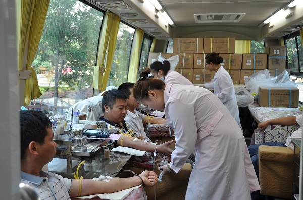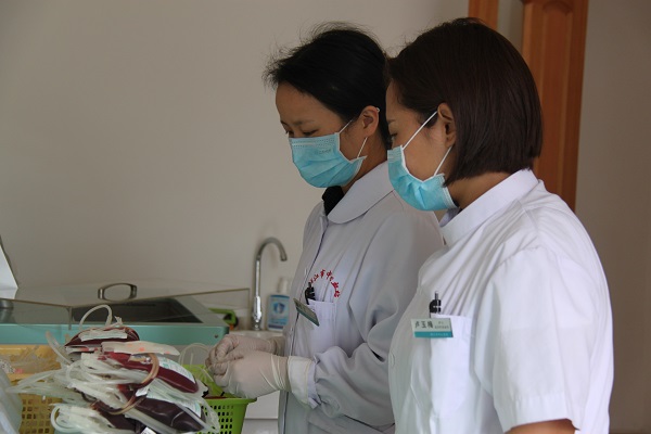 古城區(qū)醫(yī)務(wù)人員把采集的血液及時運送到中心血站進(jìn)行登記。(潘青松 攝)