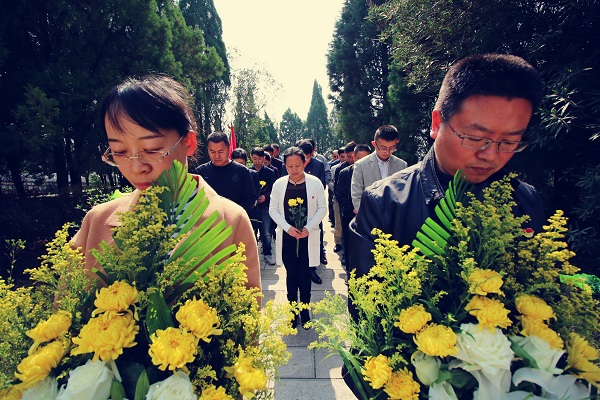 宣威市50余名年過(guò)花甲的退役老兵帶著他們的家屬來(lái)到虎頭山烈士陵園,為紅軍烈士敬獻(xiàn)花圈,緬懷先烈,告訴下一代要銘記歷史,珍愛(ài)和平。(趙文 攝)