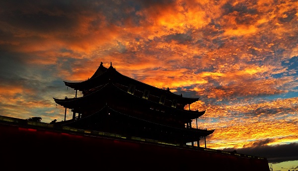 霞光捧日登天上,丹彩乘風(fēng)入殿檐。(樊瑞濤 攝)