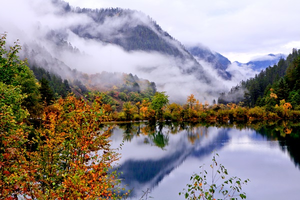 漫山遍野的五彩顏色,遠遠望去,層林盡染,云霧繚繞,流水綿綿,清澈見底,宛如人間仙境,令人沉醉。(黃光明 攝)