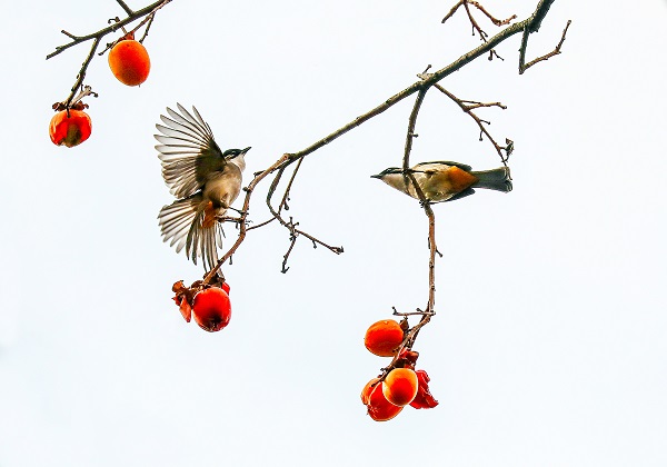 霜降前后,柿子成熟,甜糯清涼,枝頭的鳥兒也開始爭搶這秋末冬初的香甜柿子。(蔡浩德 攝)