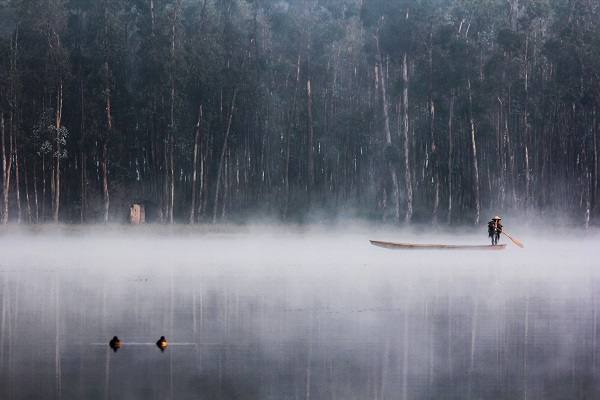 氣肅而霜降,湖面泛起了晨霧,漁民身上厚厚的蓑衣卻也無力阻擋陣陣襲來的寒意。(黃偉 攝)