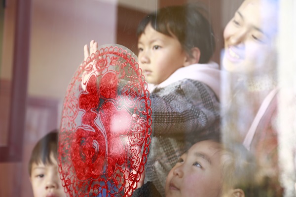 每一個(gè)鮮艷的福字都映出幸福的火花,每一個(gè)光暈都映出如夢的七彩童年。云南大理璞心自然幼兒園的孩子們貼窗花慶祝元旦。(劉昆 攝)
