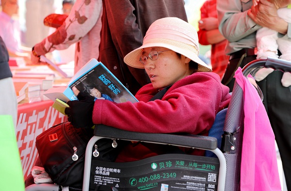 楚雄市在桃源湖畔開展全民閱讀活動,為群眾體驗快樂閱讀打開了一扇窗。一位坐著輪椅的大姐手中捧著一本書看著,沉醉在書中那優美的語言中。(楊蕾 攝)