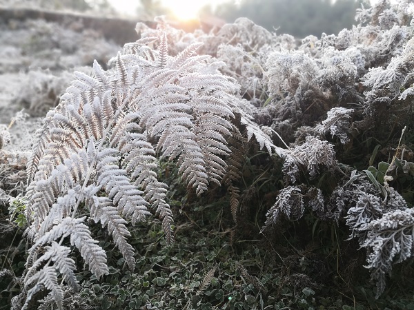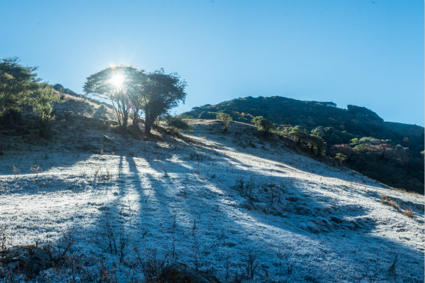 冬至,滿山遍野枯黃的草葉身上披著一層薄薄的白霜,為大自然增添了冬日的美麗。(吳燕 攝)