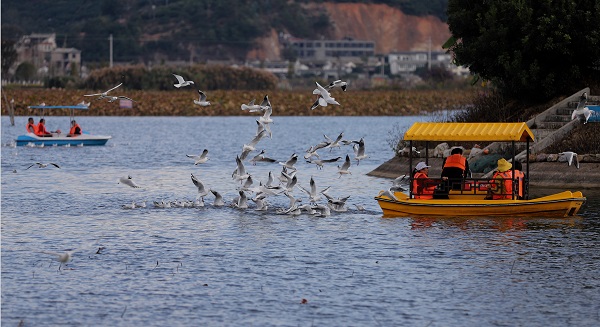 冬至?xí)r節(jié),正是劍湖最佳觀鳥季。成千上萬的候鳥在這里停歇集結(jié),泠泠冬日里,這些可愛的精靈妝點了整個劍湖。(張望星 攝)