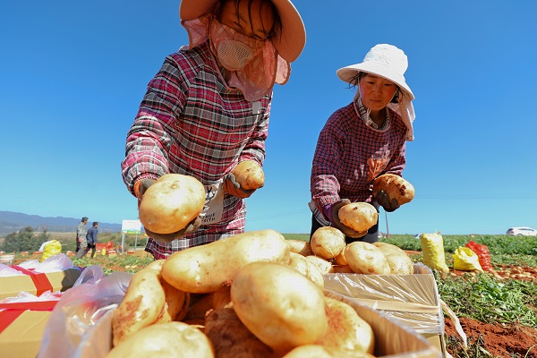 冬至前后,陸良縣小百戶鎮(zhèn)種植的萬畝秋馬鈴薯進入采收高峰期。大個頭的秋馬鈴薯在冬日暖陽的照射下愈發(fā)金燦燦,一派豐收喜悅的場景映入眼簾。(王勇 攝)