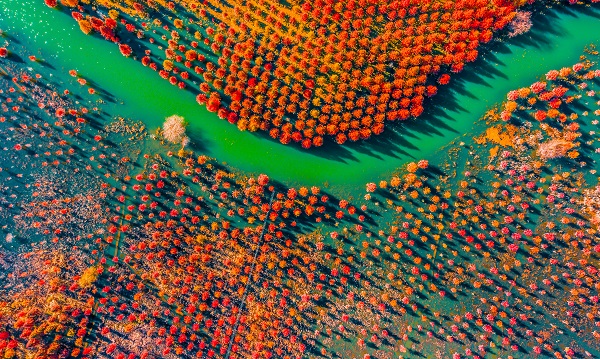 歲寒冬至,河畔的水衫林被寒霜雪凍染成紅色,燦爛無比,如同一片燃燒的火焰,點亮了眾芳凋零、蕭瑟清寒的冬季。(鐵小剛 攝)