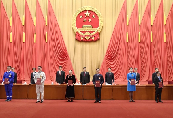 在歡快的樂曲聲中,全國勞動模范和先進(jìn)工作者代表依次登上主席臺,習(xí)近平等為他們頒發(fā)榮譽(yù)證書。